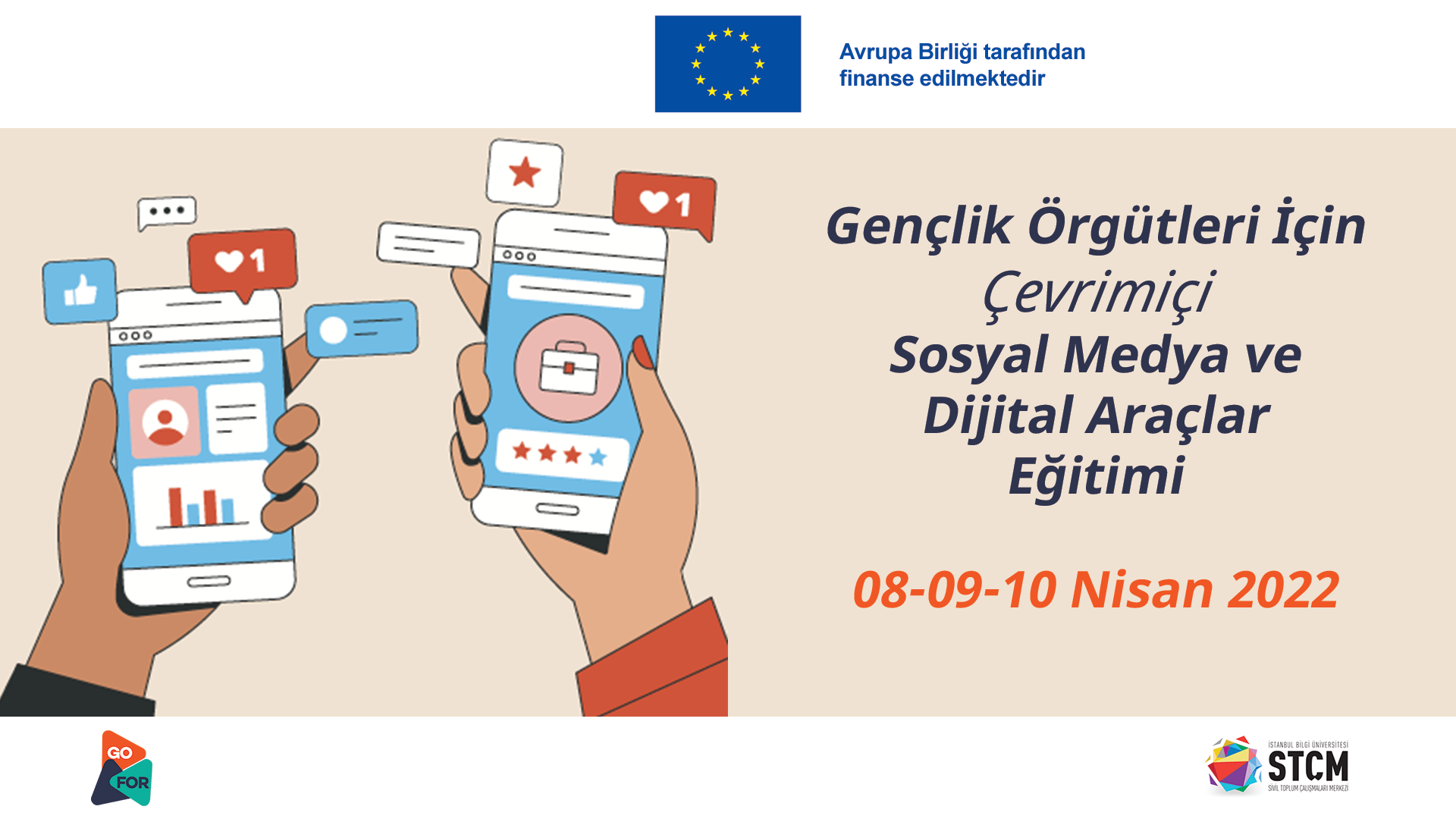Go For Youth Projesi kapsamında GoFor ve Bilgi Üniversitesi STÇM’nin hazırladığı tematik güçlendirme serilerinin üçüncüsü olan Sosyal Medya ve Dijital Araçlar eğitimi çevrimiçi olarak 8-9-10 Nisan’da gerçekleştirilecek. Eğitim Türkiye’deki hak temelli çalışan bütün gençlik örgütleri ve gruplarının katılımına açık.