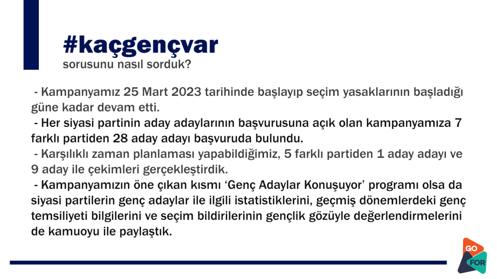 2023 Genel Seçimleri süresince yürüttüğümüz #kaçgençvar kampanyasının özetini sizlerle paylaşıyoruz. #kaçgençvar sorusunun TBMM kısmındaki cevaba artık sahibiz. Sadece 5 genç var!